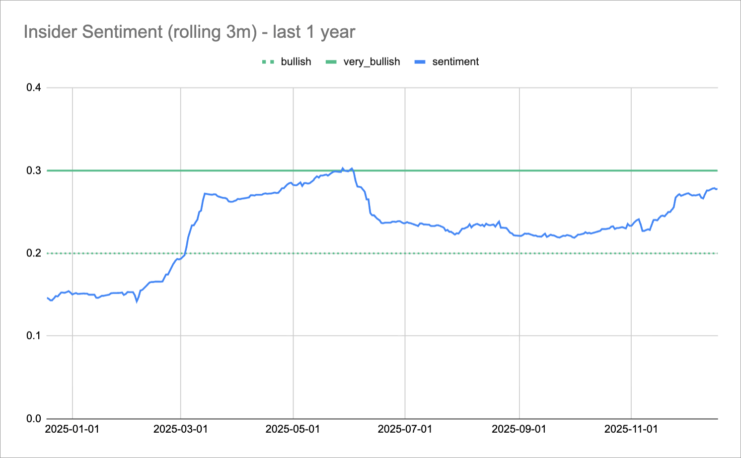 This does align with the choppiness we have been seeing in the market, but our rolling Insider Sentiment Score is still quite strong due to the above-average insider buying from the end of September through the end of November.
