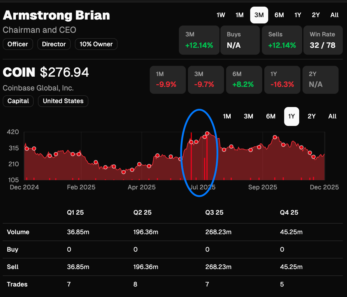 Insider selling in tech stocks is nearly useless. Nearly every insider at every tech company is constantly selling stock. Itโs mostly noise. There are a few outlier cases, like when Brian Armstrong suddenly jumps from selling $8M of the stock per sale to $160M while the stock is at all-time highs (image below).