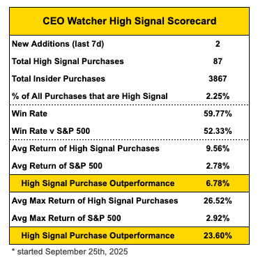 No new insider trades were flagged as High Signal, but I shared a couple of notes on some moderately interesting trades with CEO Watcher Premium subs in the Trade Notes section.