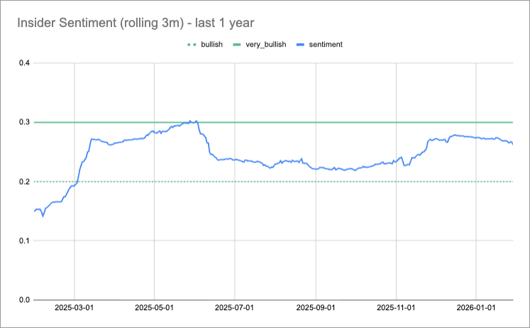 Insider sentiment continues to fade slightly, but is still well above the Bullish threshold.
