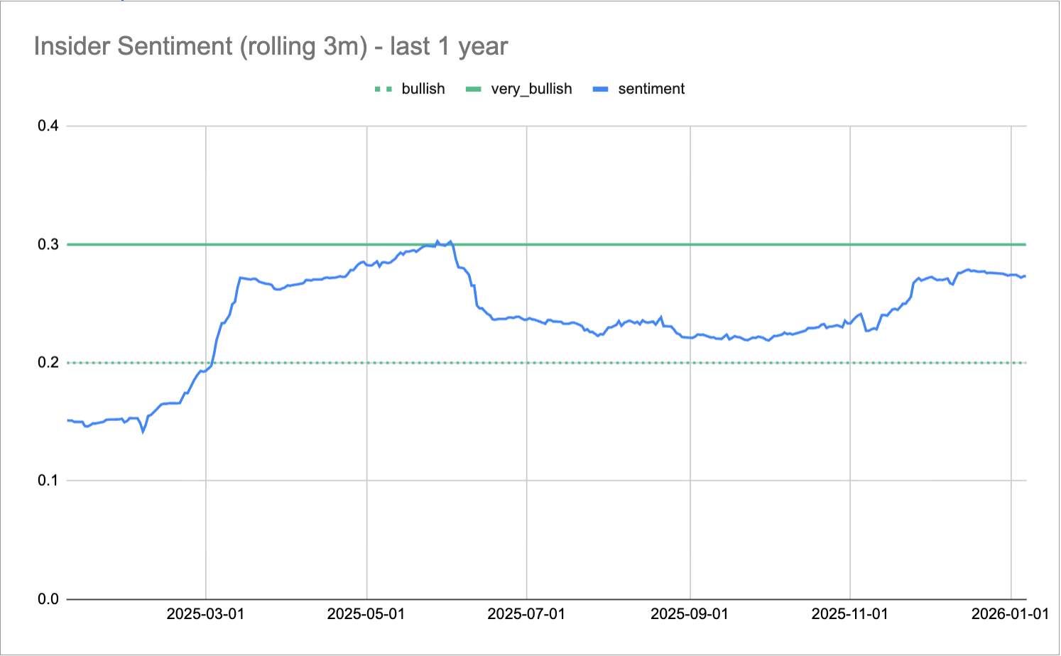 Our favorite insider sentiment chart has stopped its climb toward the “Very Bullish” threshold, but is still well into the “Bullish” range.