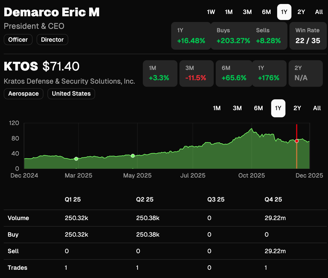 We saw a very similar growth/momentum setup at Kratos Defense (KTOS) in May. The CEO was buying the stock (and he had a killer track record), the Trump administration is very favorable for the Defense industry (good macro theme), and they were actively signing deals.