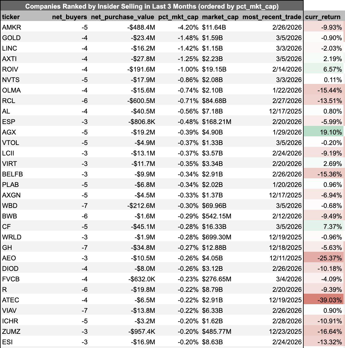 This table shows the companies with the most insider selling over the last three months (measured as the percentage of the company’s market cap insiders sold).
