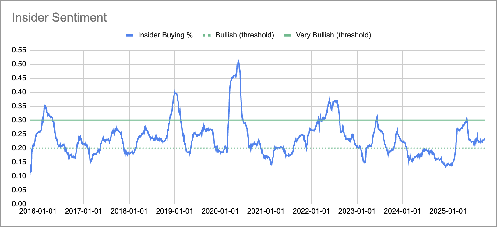 I’m not going to tell you exactly how it works, but essentially we filter out all of the trades we flag as “low signal” (stock purchase plans, dividend reinvestments, private placements, public offerings, tax sales, super small trades, late filings, etc) and then calculate the percent of insiders who are buying v selling over the last 3 months.