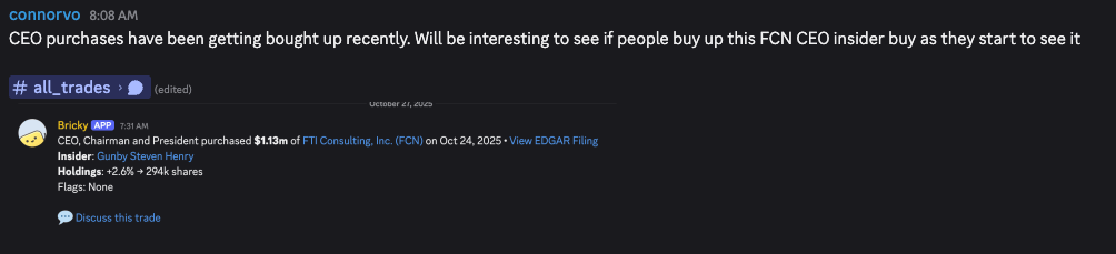 Another huge improvement we’ve made is real-time alerts on new insider trades (currently only available in the Discord, but coming to the website soon). For example, this morning, we were the first to find the CEO at FTI Consulting (FCN) buying $1M of the stock. Who knows how this one will work out, but CEO purchases have been getting some nice pops recently (this one is already up a few bucks since the alert), and it’s cool to be the first to know!