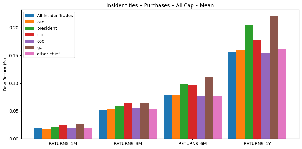 Our sample size does start to get a little small when comparing specific executives. We have ~3000 purchases by Presidents and ~1300 purchases by General Counsels, and the standard deviation for both is wider than that of the other executives, who have larger sample sizes.