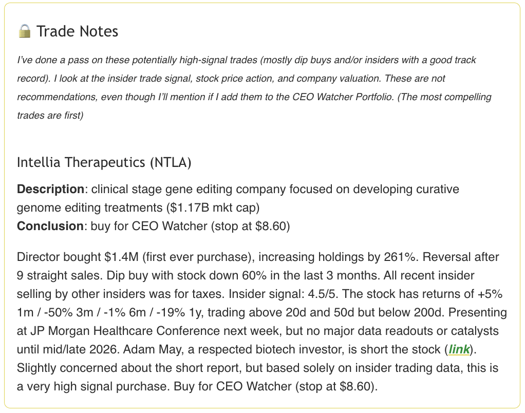 On January 8th, only one trade (out of 197) qualified as a High Signal Trade and was added to the CEO Watcher Portfolio. That trade was for Intellia Therapeutics (NTLA).