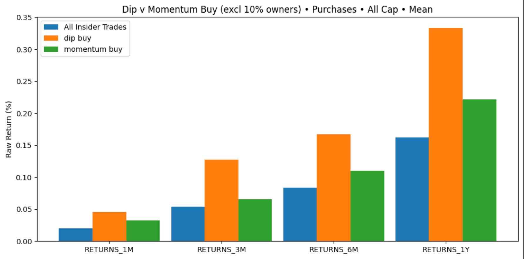 Just like all momentum strategies, Momentum Insider Purchases thrive in periods of strong market momentum (like the middle 6 months of 2025), but get hit pretty hard when that momentum stops.