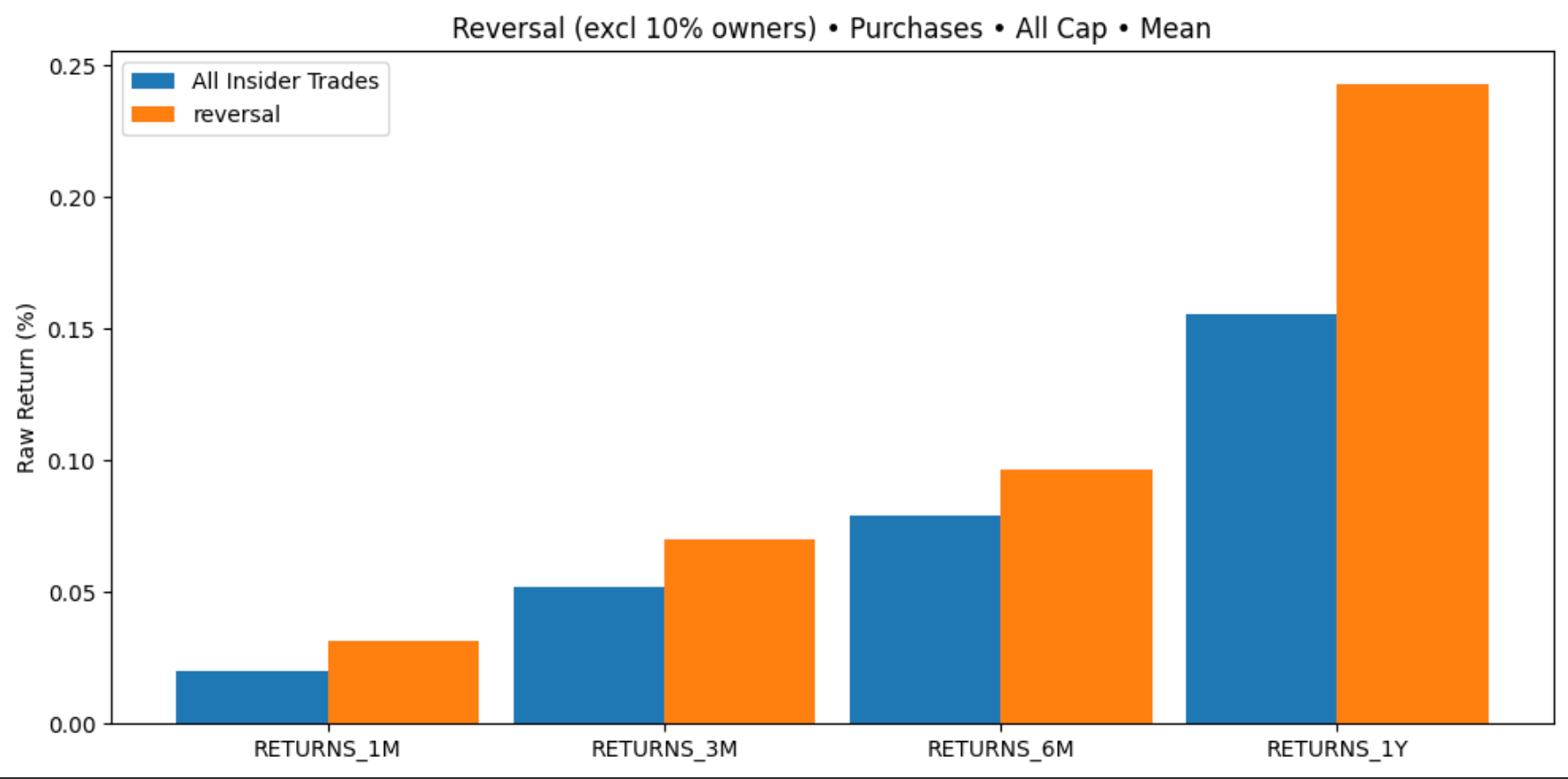 Reversals are rarer, but they also had a great 2025. There were 176 reversals (where an insider flipped from selling to buying), and those stocks are currently up 17.6%.