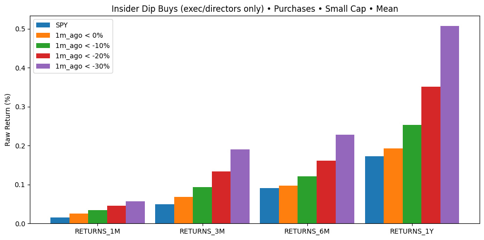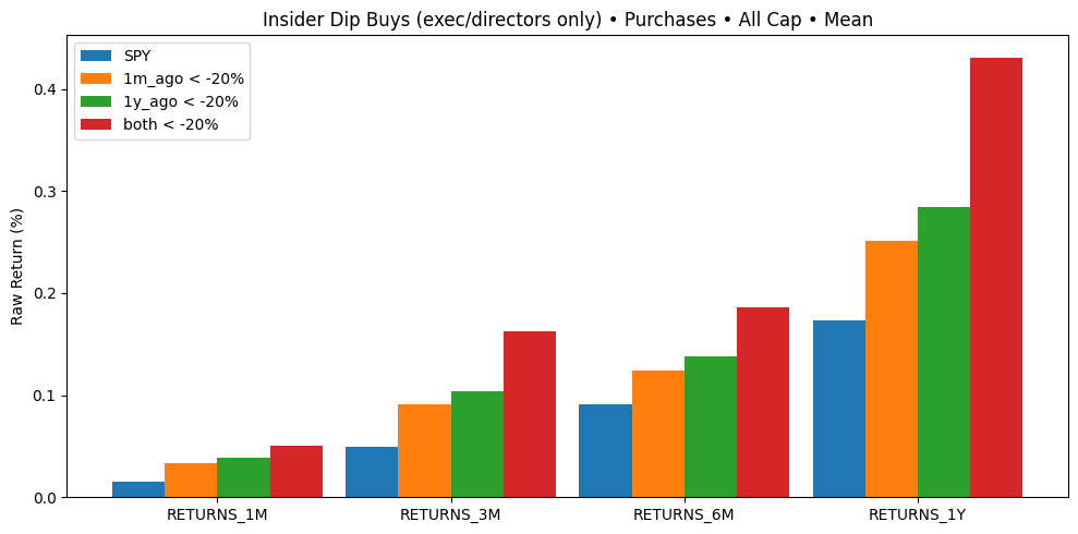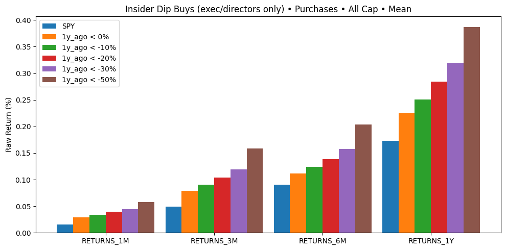 We also find that insider dip buys outperform on longer timeframes, too (1Y dip buy results in the photo below).