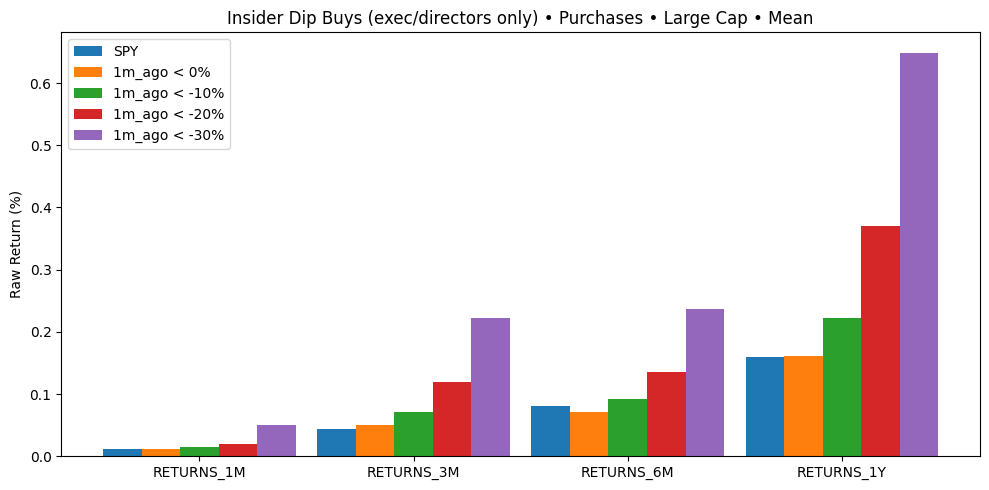 Like the academic research I shared, we find that insider dip buys outperform the S&P across all timeframes (next 1M/3M/6M/1Y) with improving performance as the dip size increases.