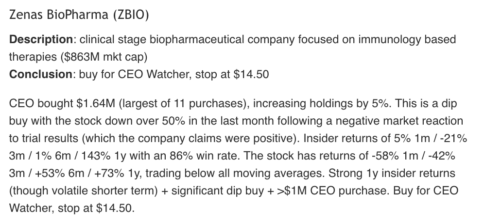 Monday morning, before market open, we found the CEO at Zenas Biopharma (ZBIO) buying $1.6M of the stock. Here is the note I shared with CEO Watcher Premium subs in the morning email (that was sent at 8:55am EST).