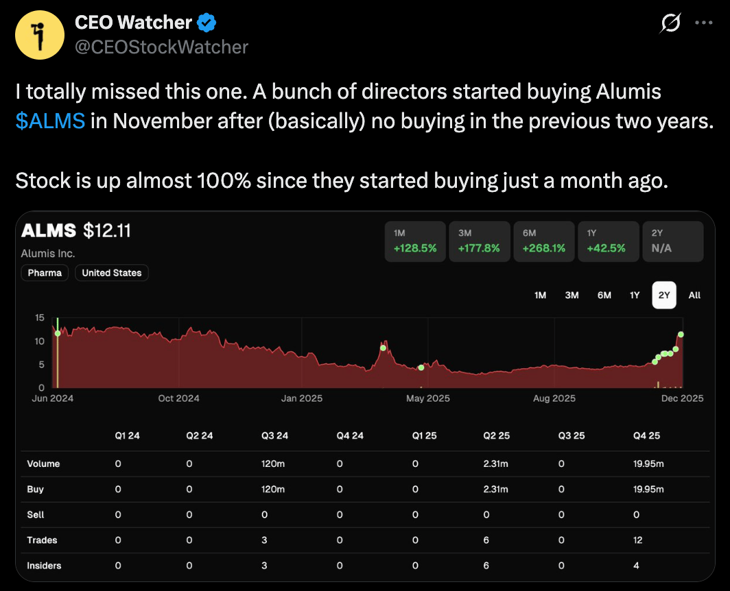 Unfortunately for me, I donât pay much attention to the biotech space, so I didnât realize they had Phase 3 trial readouts coming up. But this insider buying + price action in November/December certainly looks like some people had an inkling that the trial was going well.