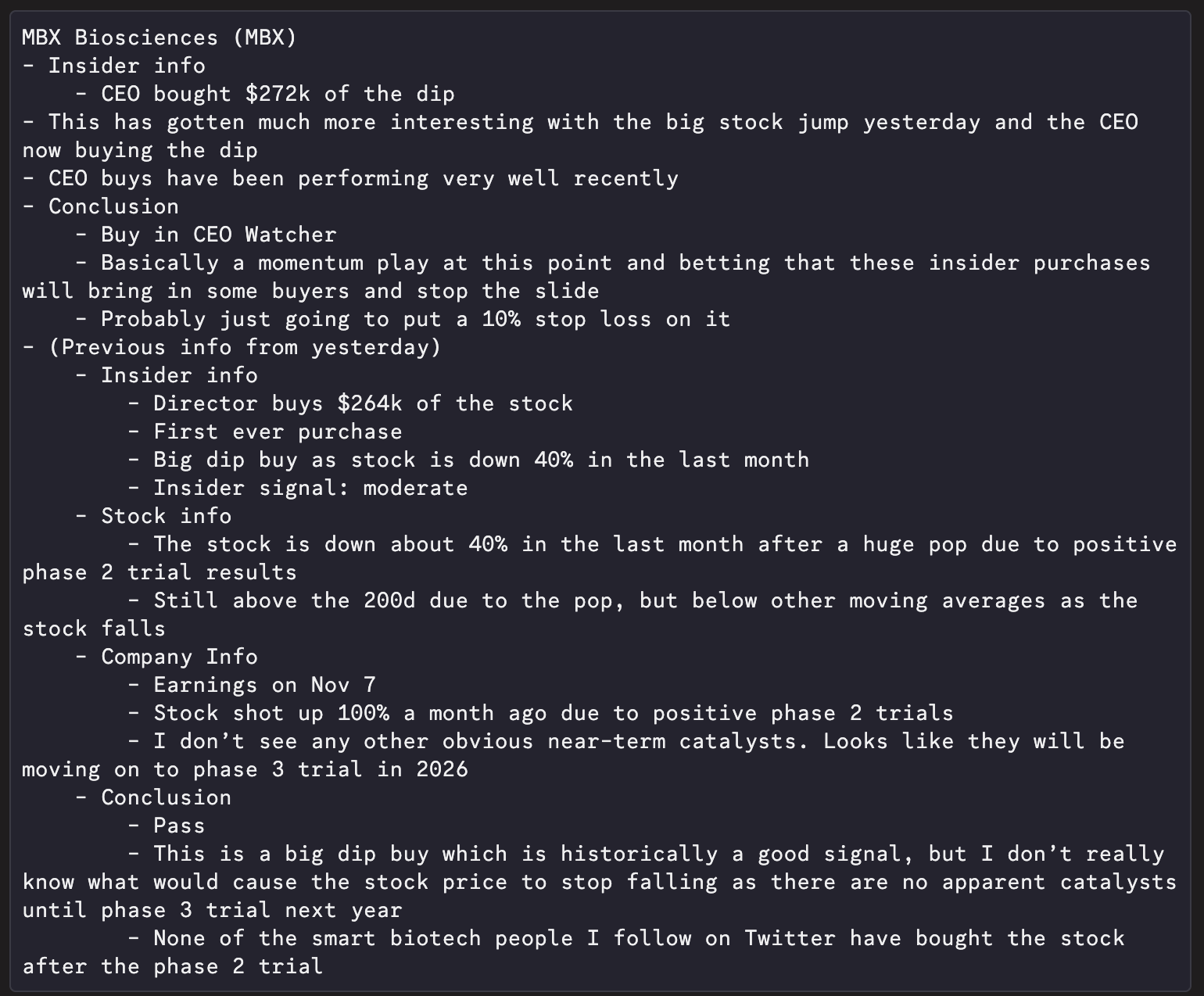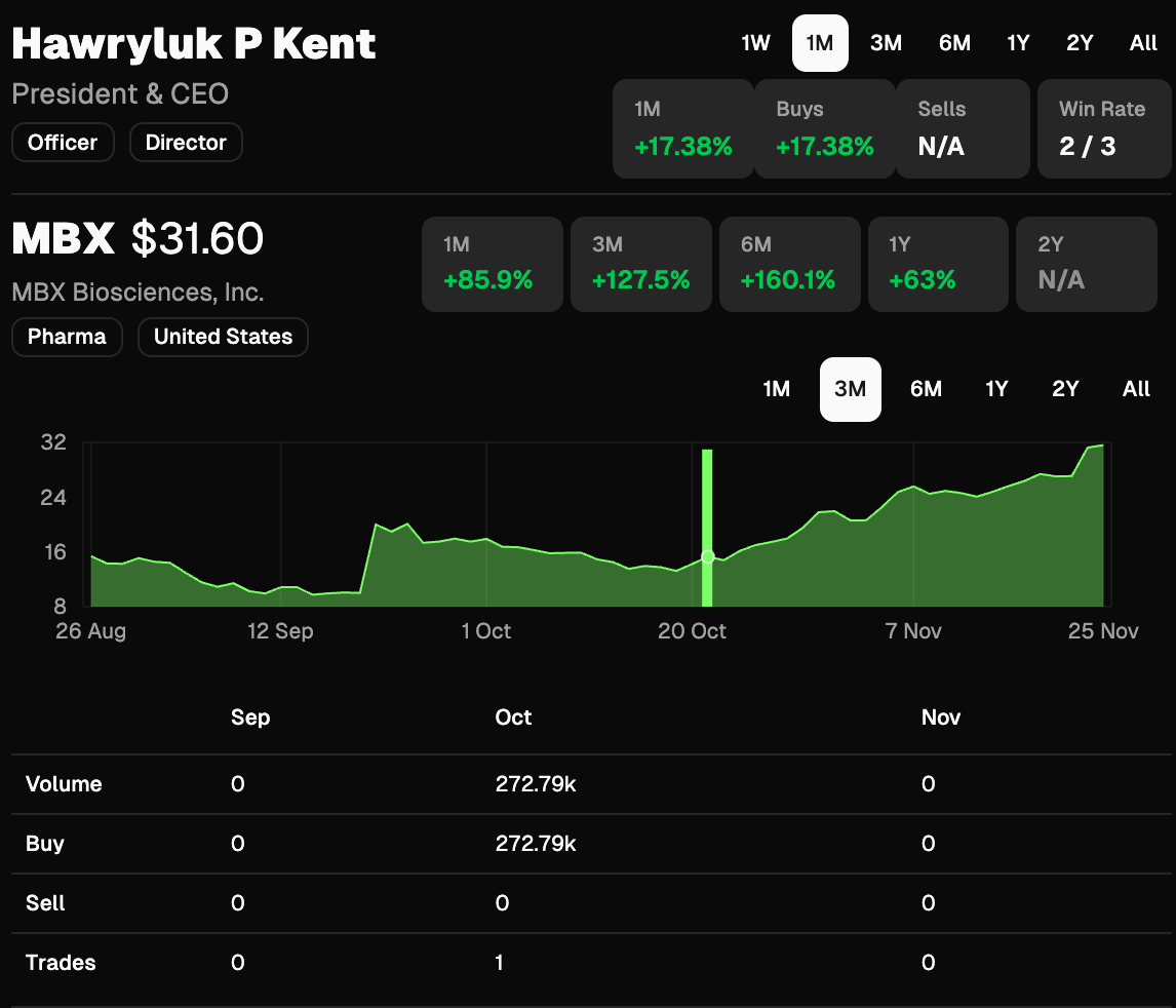 Well, one way appears to be to find a CEO buying a biotech stock that is way down. On October 22nd, I shared the note below on MBX Biosciences. (TL;DR - the stock popped 100% on positive trial results, it then fell 40%, and the CEO bought $272k).